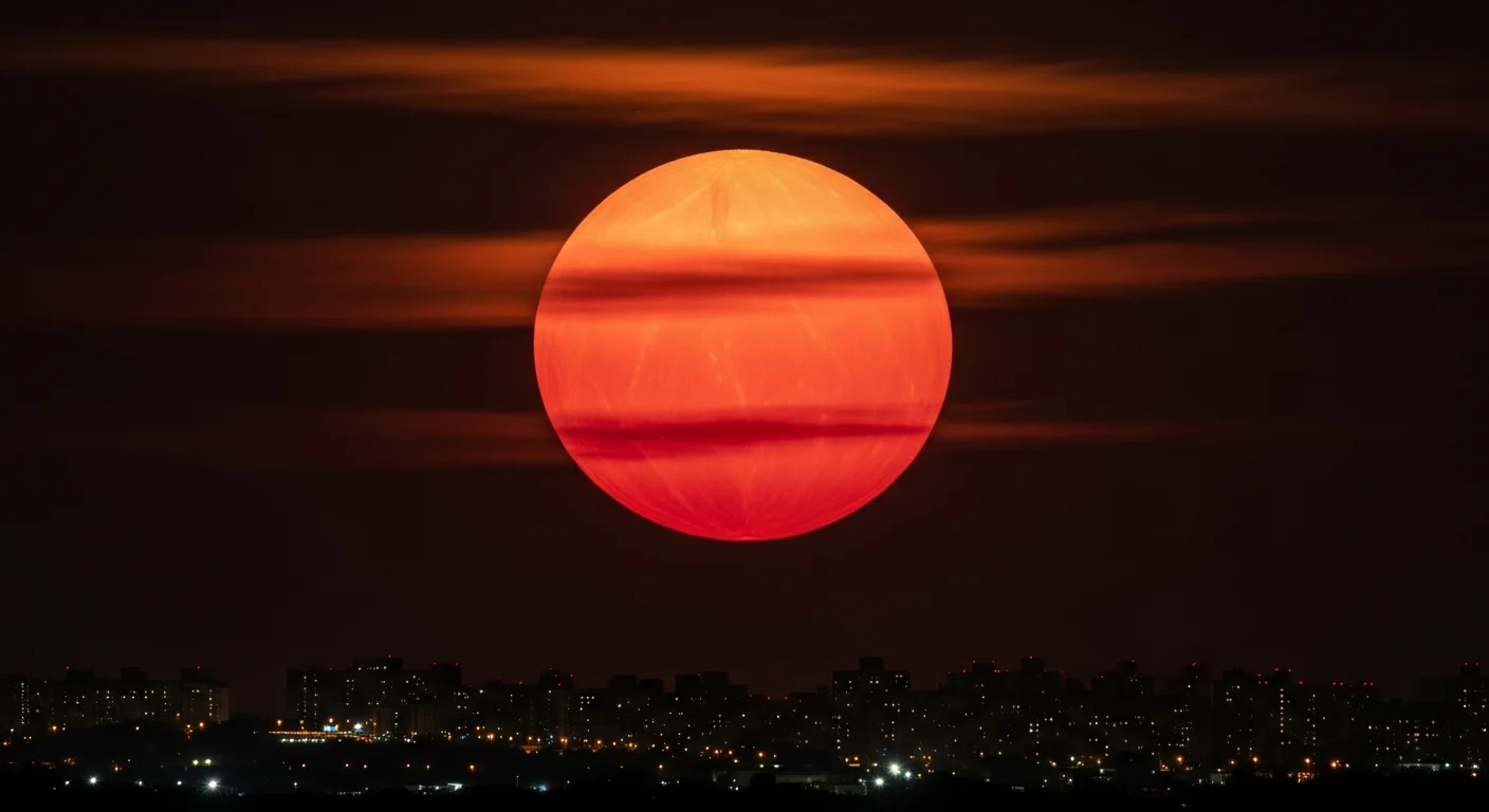 Superlua com tom avermelhado sobre cidade noturna, simbolizando a lua sangue e a superlua no céu brasileiro